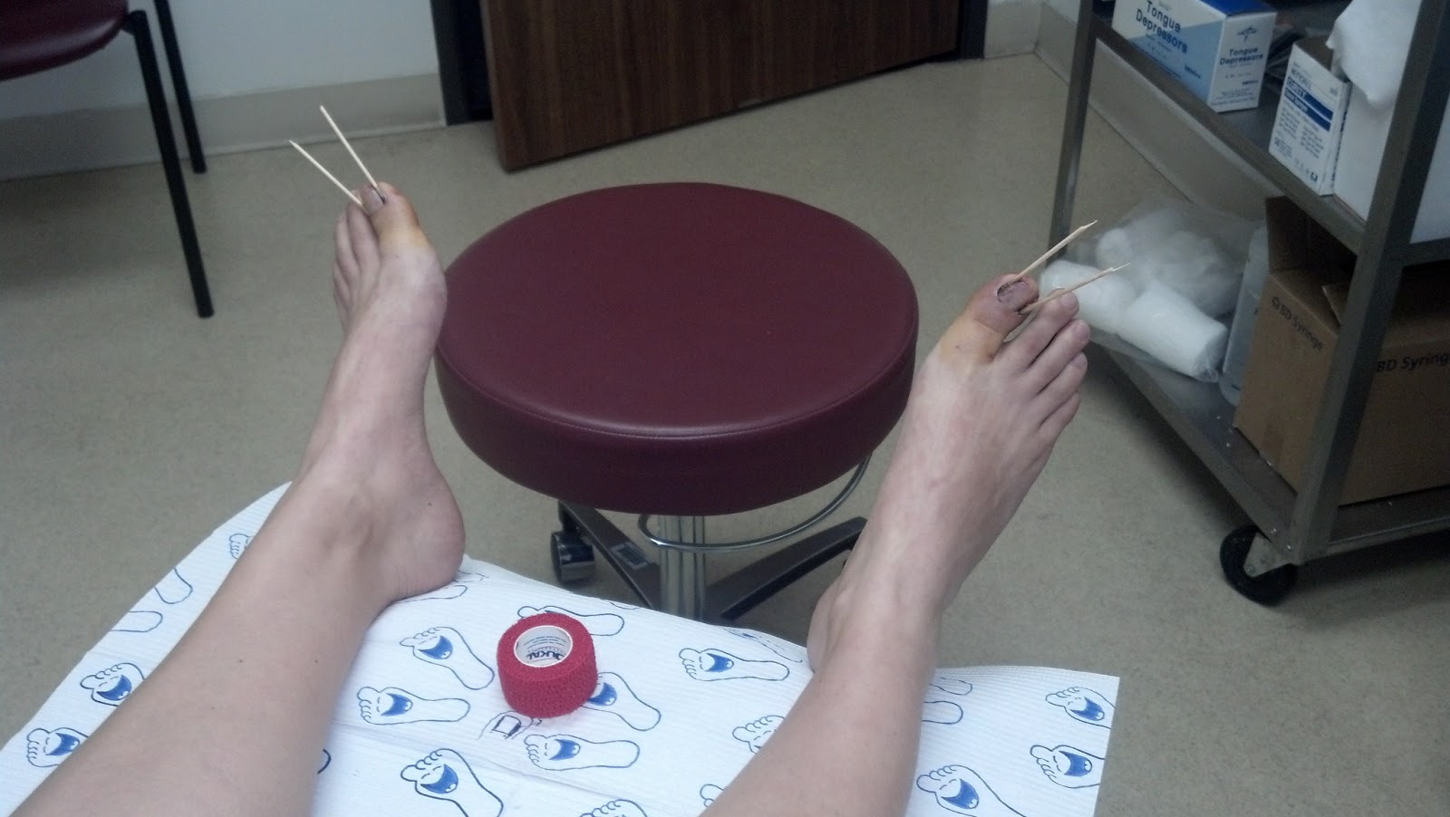 Day 2 has been a little painful. The numbing medicine has worn off and I woke up in a lot of pain. The pain medicine has helped a little bit. I slept a lot today. I never felt anything during the surgery. But here is a picture of my toes before and after the surgery. Those are tooth pick sticks on both sides of my toe. It never hurt. I loved the paper they placed down for my feet.they were smiling feet. It was a wild adventure, but I am slowly surviving it.